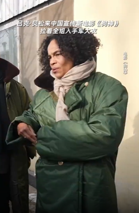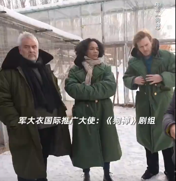 这还不够,近日,贝松再次来到中国宣传新电影《狗神》,不仅自己舍不得脱下,还拉上媳妇、主创戛纳影帝卡莱伯·兰德里·琼斯一起换装,被网友直呼“军大衣国际推广剧组”。
