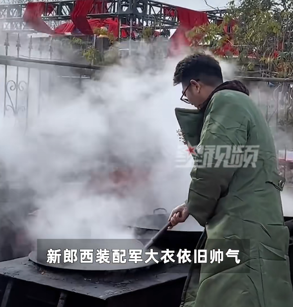 上:大学生身披军大衣上早八;下:新郎身着军大衣