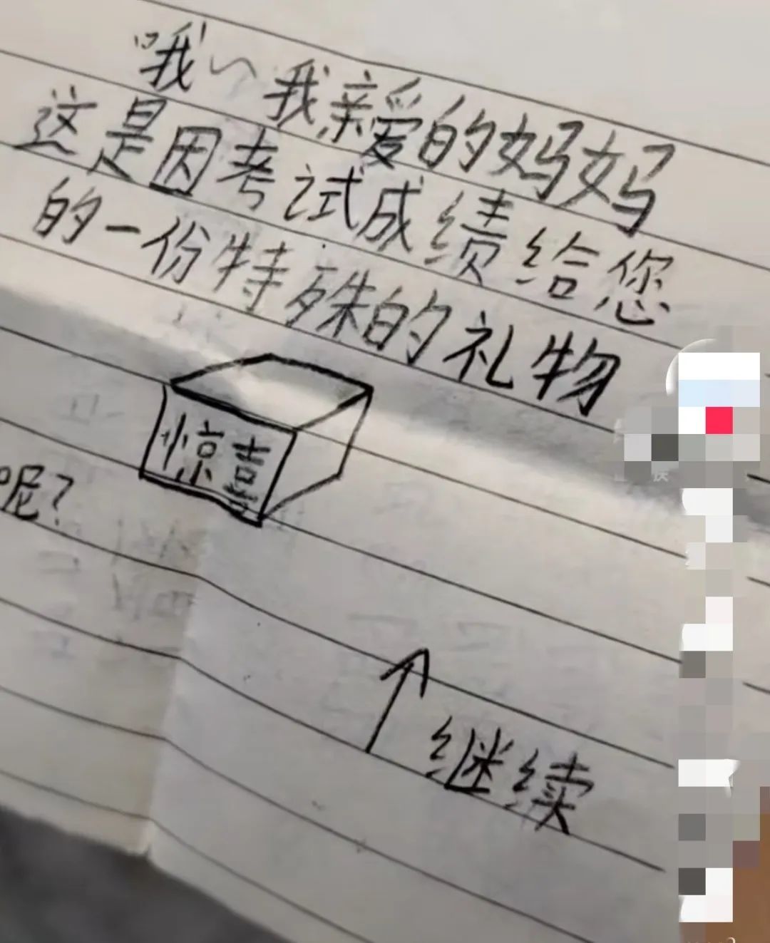 “哦~我亲爱的妈妈,这是因考试成绩给您的一份特殊的礼物。”