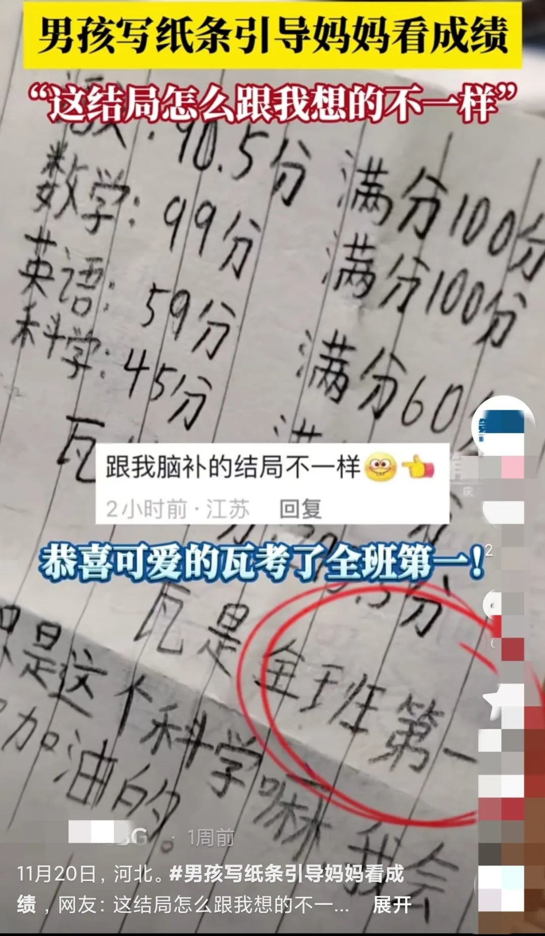 纸条里面,他引导妈妈根据语言提示看他的考试成绩: