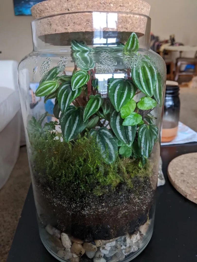 我们唯一需要做的就是将这些微型的玻璃容器,摆放在窗台边或阳台边,每天有适当的散射光,可以保证植物能正常进行光合作用。但要注意避免过度暴晒,否则里面的植物很快就会被晒干,水分也会快速被蒸发,在这些封闭式的玻璃容器里,最好是栽培比较喜欢水分,又比较耐贫瘠的植物,比如常见的观赏苔藓和各类蕨类植物,也就只有这两类植物适合栽种在封闭式的玻璃容器里了。