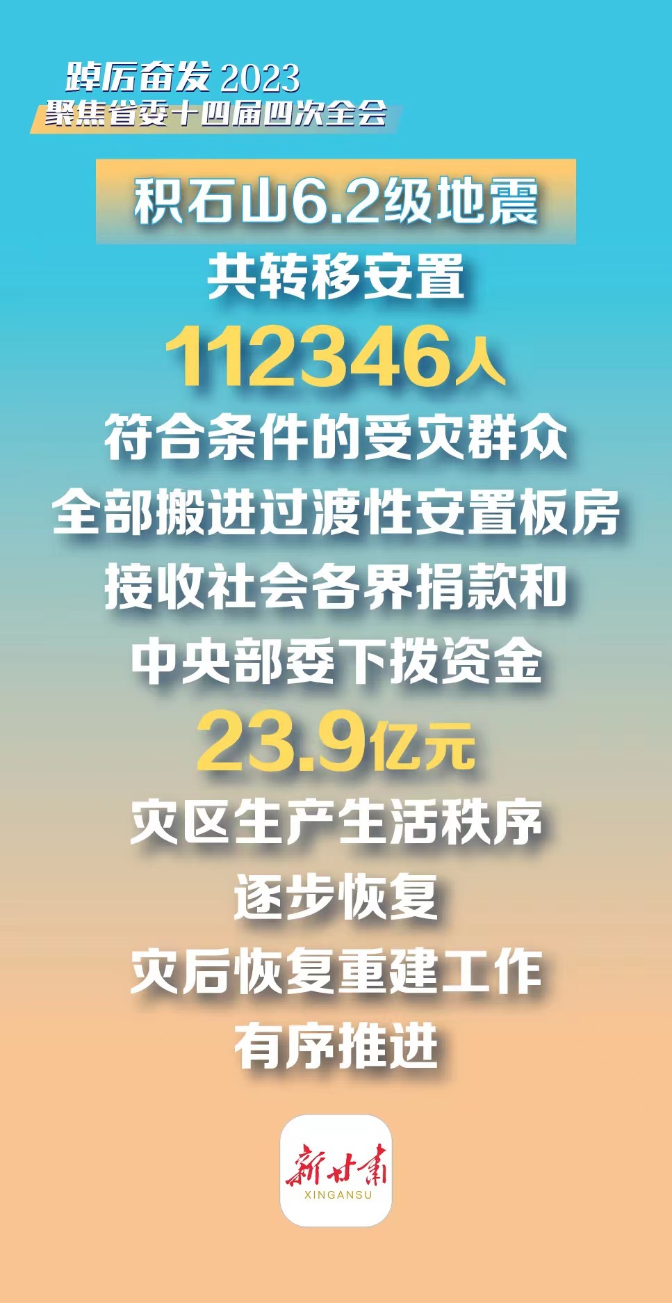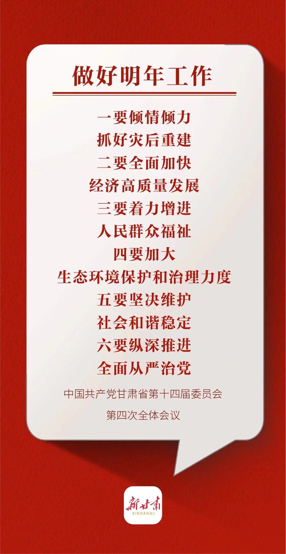 明年是推进和深化中国式现代化甘肃实践的关键一年,任务艰巨而繁重、责任光荣而重大。各级各方面要按照省委十四届四次全会要求,倾情倾力抓好积石山6.2级地震灾后重建,众志成城打赢打好灾后重建攻坚战;加快经济高质量发展,全面做好“三农”工作,全面落实扩大内需战略,全面深化改革开放;着力增进人民群众福祉,进一步做好就业工作、健全社会保障体系、推进社会事业发展;加大生态环境保护和治理力度,加快实施重大工程、推进污染防治、各类问题整改;坚决维护社会和谐稳定,全力加强社会治理、安全生产、风险化解;纵深推进全面从严治党,抓好基层党组织建设、干部队伍建设、党风廉政建设。