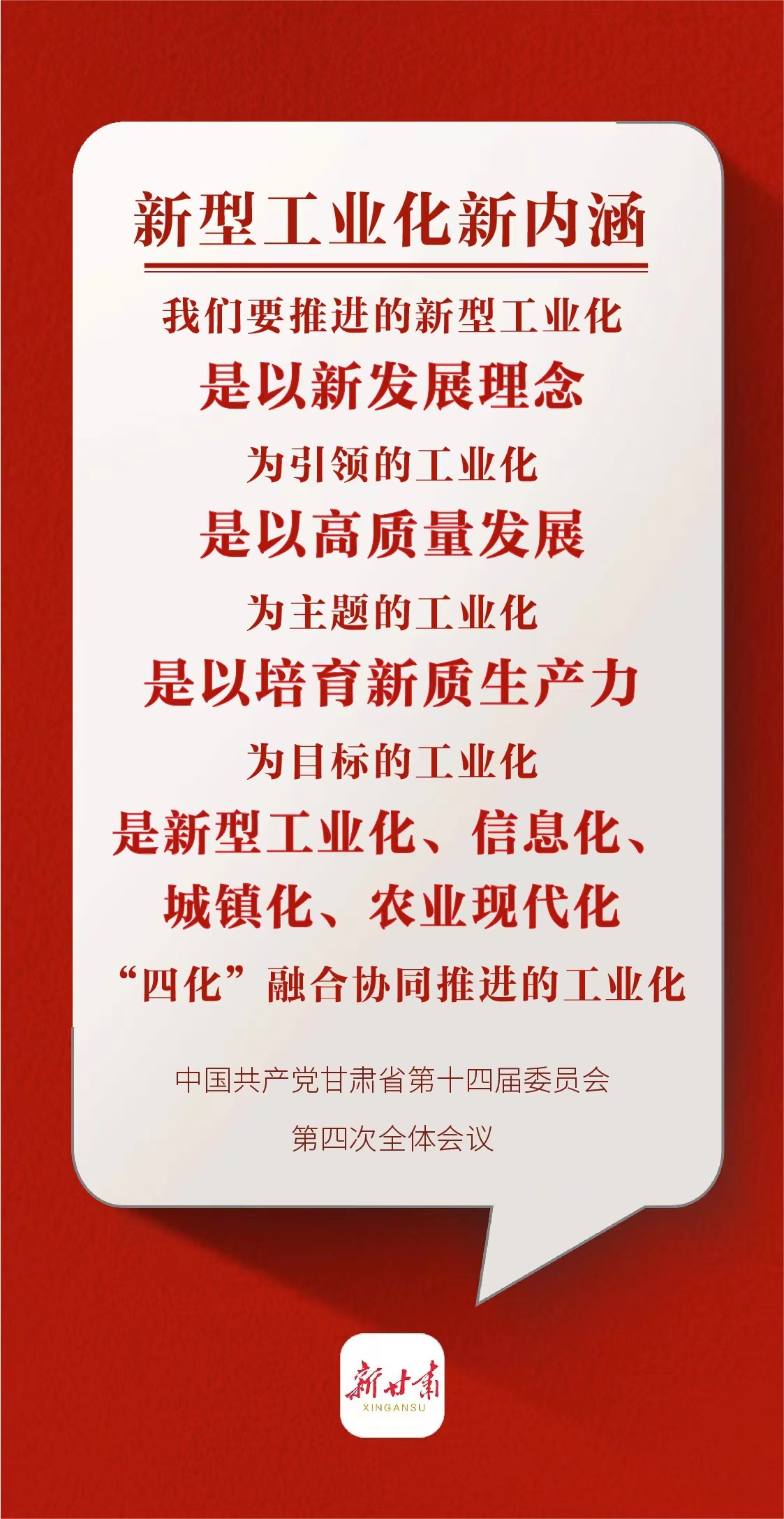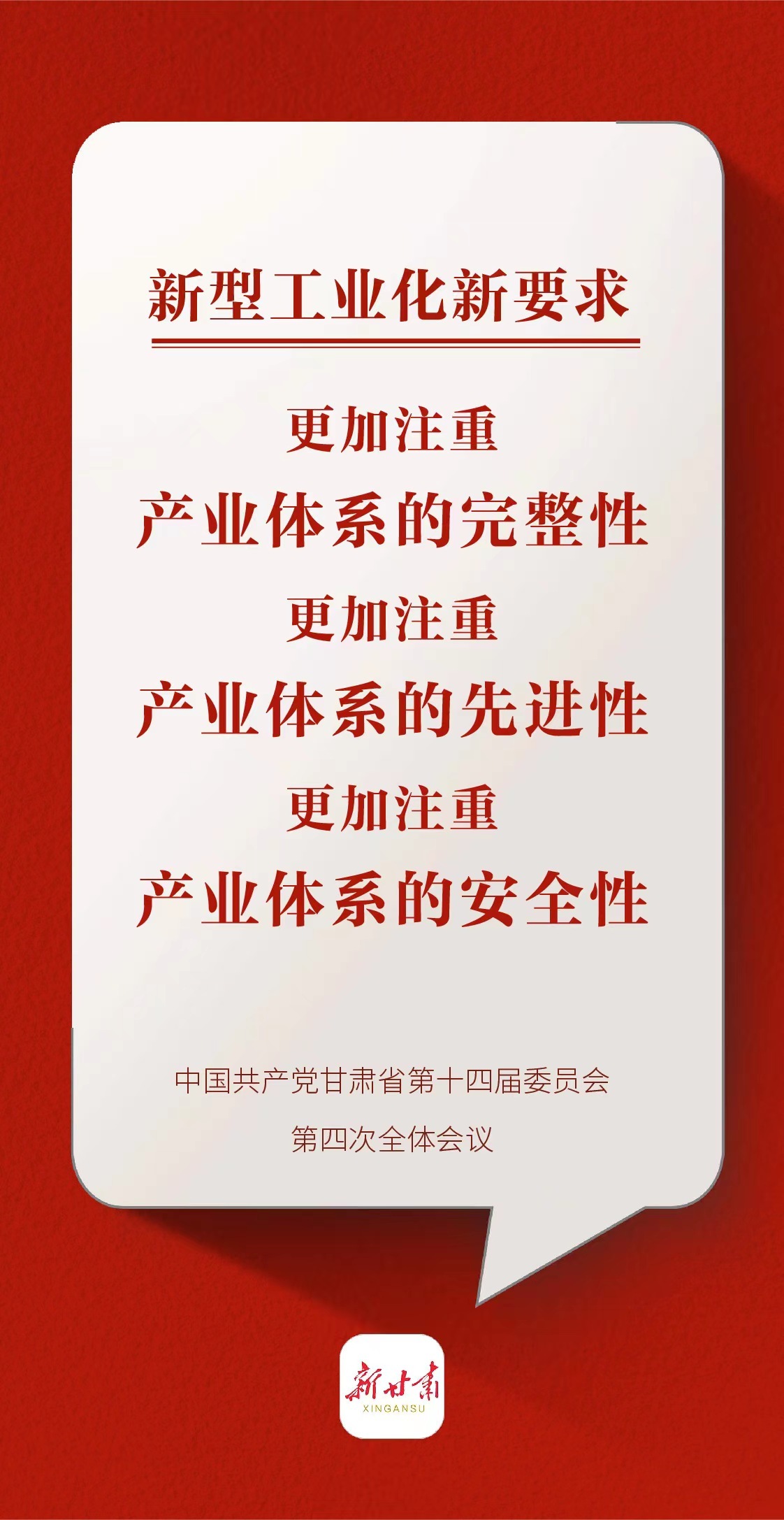 全会指出,党的十八大以来,习近平总书记从全面建设社会主义现代化国家的战略高度,就新型工业化一系列重大理论和实践问题作出重要论述,提出一系列新思想新观点新论断,极大丰富和发展了我们党对工业化的规律性认识,为推进新型工业化提供了行动指南。习近平总书记非常重视甘肃产业特别是工业发展,两次视察甘肃都作出重要指示,这是我省推进新型工业化、建设现代化产业体系的根本遵循。全省各级各部门要深入学习贯彻习近平总书记关于新型工业化的重要论述和重要指示要求,切实用以武装头脑、指导实践、推动工作。