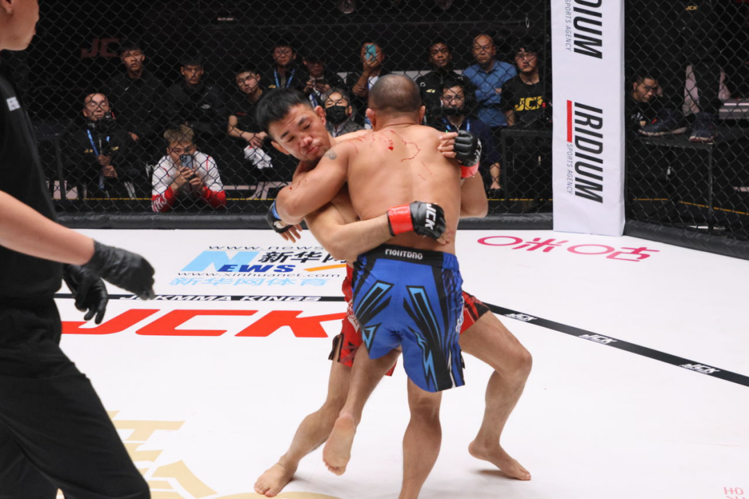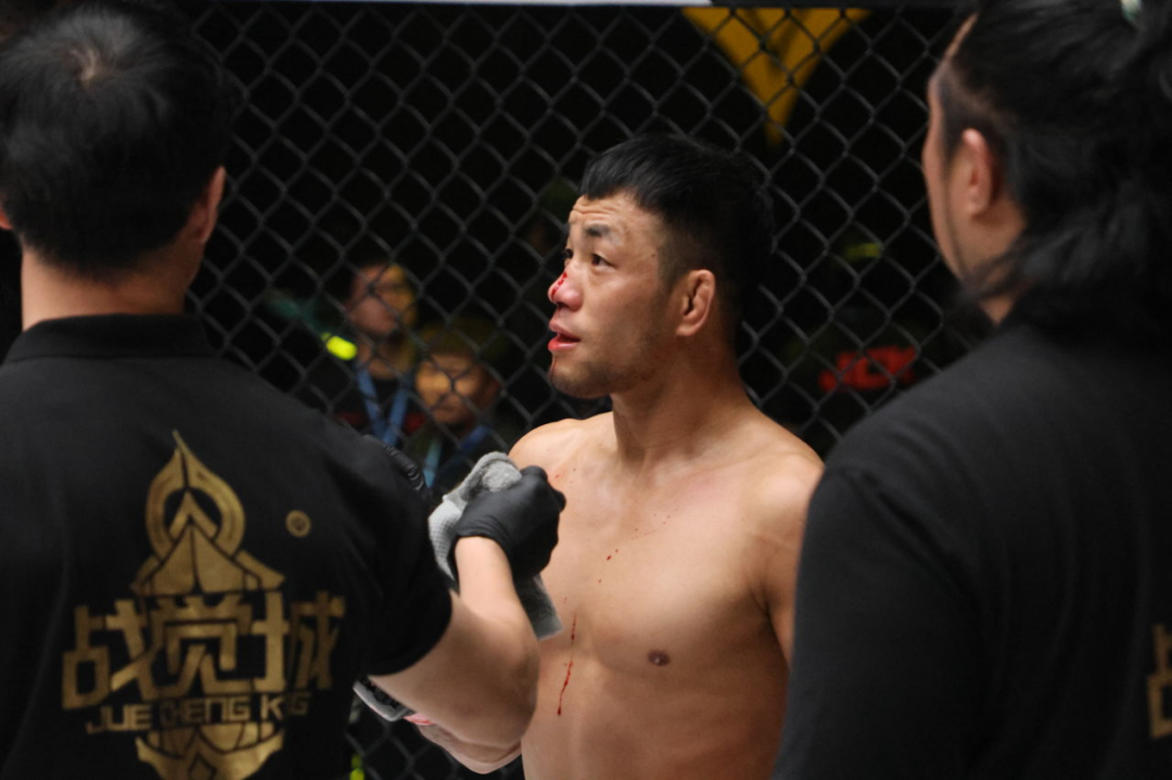 比赛开始后尚志法率先重拳出击命中,不过在两人近身时却无意间被撞破鼻子导致血流不止,虽然已经在地面拿到优势位置,也只得被裁判叫停战斗处理伤口。
