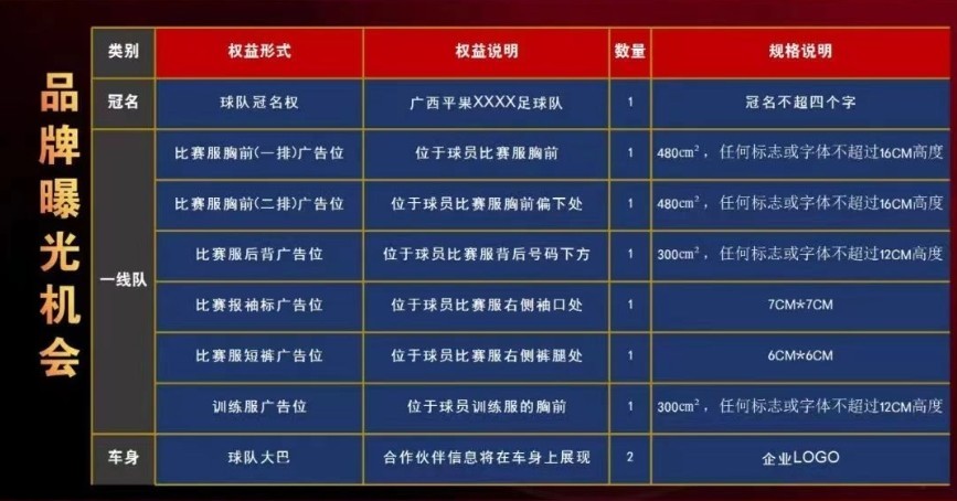 在涉及到球队的品牌曝光机会这一版块,俱乐部将球队冠名权放在了首位。其中关于这一权益的说明是“广西平果XXXX足球队”,并说明冠名不超过四个字。因此下赛季,广西平果哈嘹的新队名应该就会带上冠名赞助商的名字。