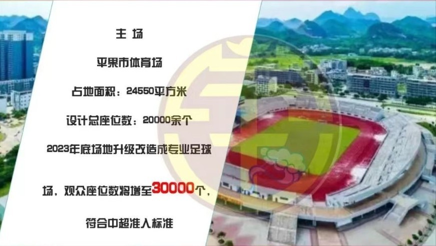 此外,广西平果哈嘹俱乐部还提到,2023年底球队主场平果市体育场会改造成专业足球场,观众座位数将从原来的20000个增至30000个,符合中超准入标准。