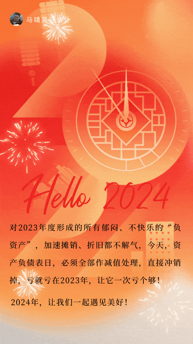 感慨一下:对2023年度形成的所有郁闷、不快乐的“负资产”,加速摊销、折旧都不解气,今天,资产负债表日,必须全部作减值处理,直接冲销掉,亏就亏在2023年,让它一次亏个够!2024年,让我们一起遇见美好!
