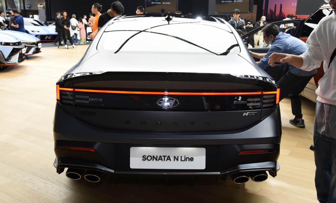 车身侧面,全新索纳塔采用轿跑式车身,车顶从前排向后下压,车身轮廓与现款车型区别不大。车尾部分,现代汽车针对车尾进行重新设计,搭配全新造型的贯穿式尾灯组,保险杠也采用新造型风格,视觉层次感突出。此外,N Line版本车型采用双边共四出排气布局,更具运动气息。尺寸方面,新车长宽高分别为4945/1860/1445mm,轴距为2875mm。