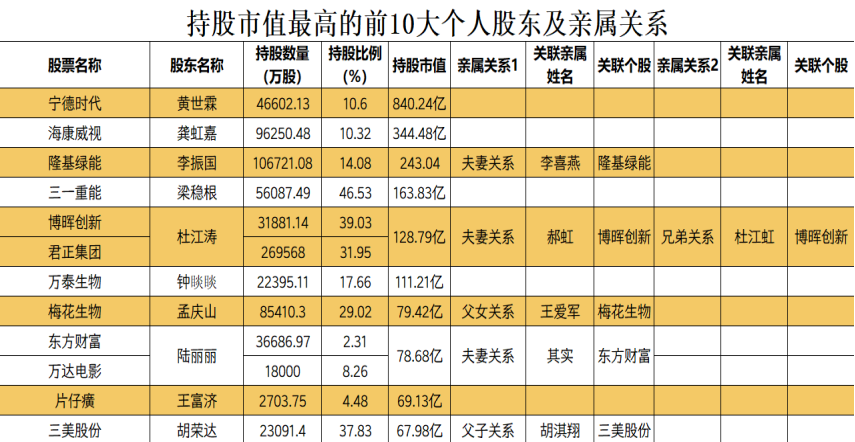 在A股市场中,有一批自然人,凭借着独到的眼光、杀伐果决的商业智慧,占据着A股个人持股市值最高前十的位置。