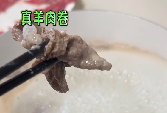 最后,小编将两种肉卷放在锅中涮。羊肉卷煮后会缩成一团,颜色比较自然,夹起来没有散,肉质紧实,吃起来柔软鲜嫩,而且羊肉味儿很浓。