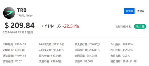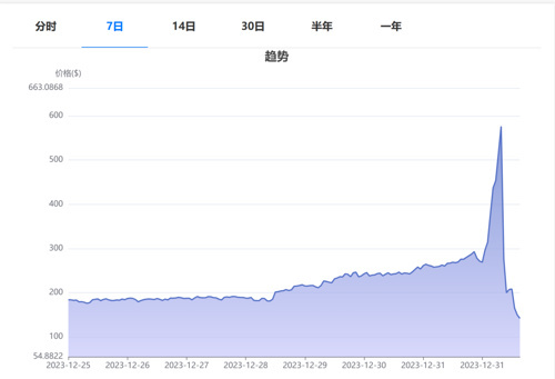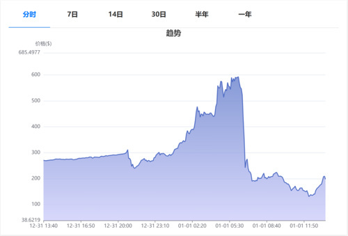 2024年1月1日凌晨6点左右,价格一路攀升近600美元的虚拟货币TRB突然直线跳水,一度跌破200美元。截至发稿,仍然较前一个交易日下跌超20%,较今天的最高位576美元,下跌了超60%。