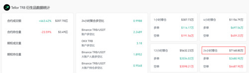 另据Coinglass数据显示,受TRB价格剧烈波动影响,其过去24小时爆仓量达7168万美元(约合人民币超5亿元),爆仓金额居首位。
