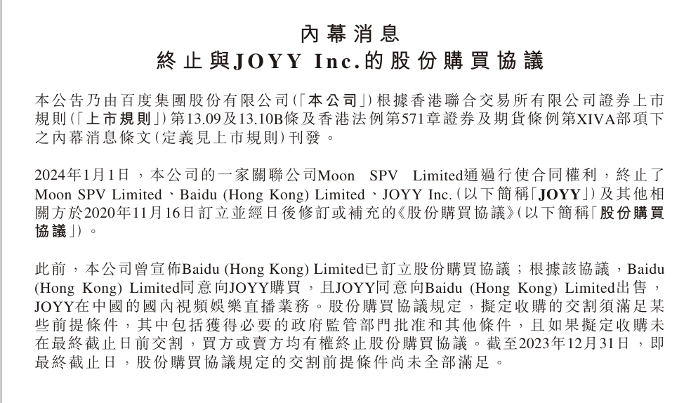 2024年1月1日晚间,港交所公告显示,百度关联方Moon按照此前签署的协议,终止对YY Live的股权收购协议。