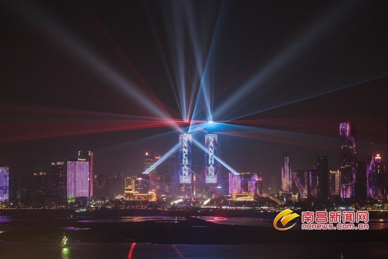 19时58分,伴随着激情的音乐,绿地双子塔和晚会主舞台充满科技与未来感的大型激光灯光秀准时开启。沿秋水广场、崛起广场、绿地缤纷城、绿地双子塔等城市地标串起的新城中轴线,以天为幕,以一江两岸为屏,用全城180多座城市高楼,打造出一场长达4个小时的“光启中轴 龙腾红谷”城市灯光秀,照亮出南昌最美天际线。