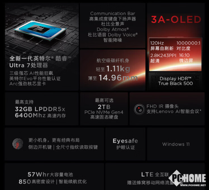 此外,该笔记本采用了航空级黑色碳纤+稀土铝合金轻薄材质机身,薄约14.96mm,轻至1.11kg,保持经典布局的同时带来了更小的机身。其该款笔记本电脑内置的电池容量为57Wh,配合全新升级PSR2.0芯片及智能调度,进一步提高了续航能力。另外还带有侧边开机键、全尺寸指纹读取按键、支持Lenovo AI智能会议的FHR IR摄像头、高集成度键盘下扬声器支持杜比全景声/杜比语音/智能降噪。接口配置包括USB4、USB-A(5Gbps)、HDMI 2.1、SIM卡槽、以及3.5mm音频插孔。此外,标志性小红帽配合经典三键设计及120mm加大多点触控板,还有1.5mm键程X支架和微小型键帽,键盘带背光,提供了舒适的输入体验。