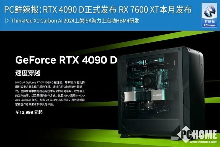 新年快乐!上周,英伟达正式发布了RTX 4090 D显卡,规格阉割定价不变;备案显示AMD即将发布全新的RX 7600 XT显卡,将配16GB大显存;联想上新ThinkPad X1 Carbon AI 2024款笔记本;SK海力士今年启动HBM4内存研发。