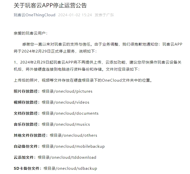 感谢您一直以来对玩客云的支持与信任。由于业务调整,我们很抱歉地通知您:玩客云APP将于2024年2月29日正式停止服务,说明如下: