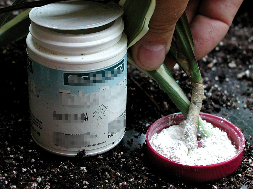 在涂抹生根粉的时候,最好是先用一个小容器,倒出一点生根粉,不要直接将叶片插入生根粉瓶子或袋子里,否则会污染所有的生根粉。