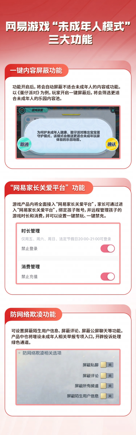 在网易游戏“未成年人模式” 中,“网易家长关爱平台”也将首次接入游戏产品内,方便家长快速绑定未成年人账号,远程管理孩子的游戏时长和消费,并可以设置一键禁玩、一键禁充。此前,已有800万家长使用网易家长关爱平台功能,通过对该平台的不断完善,不仅帮助家长化解了家庭管理中存在的难点、痛点,也让家、企双方的协同治理变得更为同频高效,有利于打通未保工作的“最后一公里”。