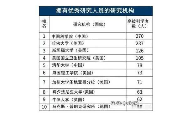 英国调查公司Clarivate的调查结果显示,从优秀研究人员聚集的研究机构这一维度来看,中国科学院超过美国哈佛大学,首次排第一名。据悉,Clarivate根据论文被引用次数,调查质量高的研究成果。同时将过去10年多次执笔排名前1%的论文的研究人员定义为“高被引学者(HCR)”。
