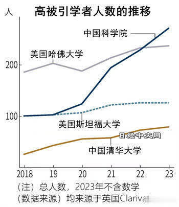 从不同国家和地区的“高被引学者”人数来看,中国为1275人,仅次于美国(2669人)排在第2位。2023年在总人数中所占的比例达到17.9%,相较于5年前(2018年)的7.9%有所增加。不过,日媒表示,虽然中国的势头越来越强劲,但也存在课题。在Clarivate授予诺贝尔奖级别研究人员的“Clarivate引文桂冠奖”方面,2023年没有中国研究人员获奖。林幸秀则认为,中国要培养出类拔萃的研究人员,需要向欧美学习并与其展开合作。
