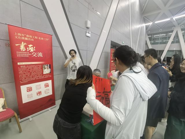 活动期间还开展了多场书画活动,上海中国画院画师、上海美术家协会理事庞飞,上海市群众艺术馆书法指导、上海市书法家协会副主席田文惠,嘉定区书法家协会副主席、高级美术师包仕武在现场挥毫,创作出数幅墨宝赠予驻岛军警民。中国艺术研究院中国篆刻院研究员、上海韩天衡美术馆馆长张炜羽现场篆刻三沙印章,赠予海南省三沙市旅游文化和交通运输局。