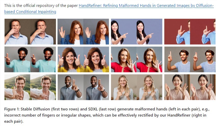 为了解决这个问题,HandRefiner提出了一种条件修补方法,可以在不改变图片其他部分的情况下,修正那些形状不正常的手部图像。