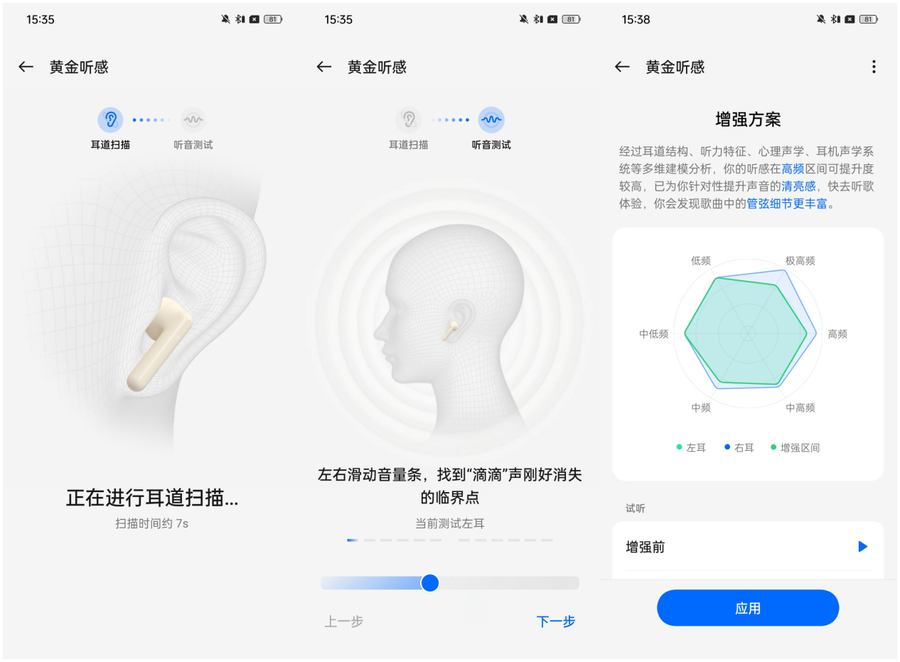 一加 Buds 3支持黄金听感2.0,通过泄露补偿、耳道补偿、个性化听感三大技术,实现个人声音的定制,整个过程操作简单,可以轻松定制适合自己的声音。