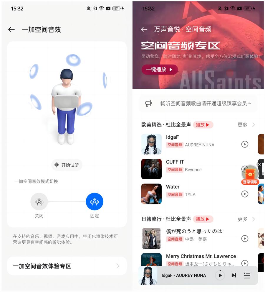 一加还提供了空间音效体验专区,可以聆听高品质的杜比全景声音源。试听一加 Buds 3 的空间音频音乐,可以很明显的感受到音乐的层次感,人声仿佛在耳边传出,然后是环绕的音乐的声音,整体声音更加立体,而不是在一个平面当中。