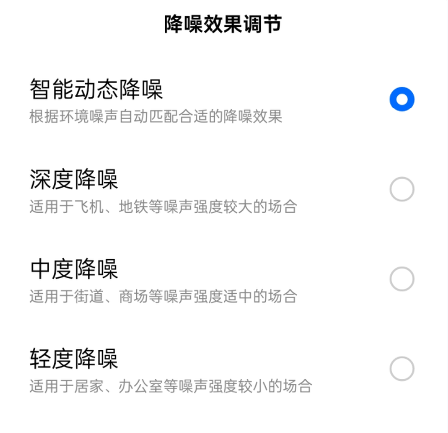 用户也可以根据自己的需求手动调整降噪模式,支持轻度、中度、深度三种降噪模式。
