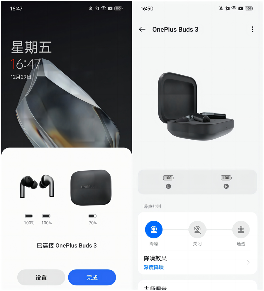 一加 Buds 3配合一加手机可以实现开盖闪联的体验,配对更加方便。在配对之后,每次连接耳机都会在手机上进行弹窗,显示耳机以及充电盒的电量信息。