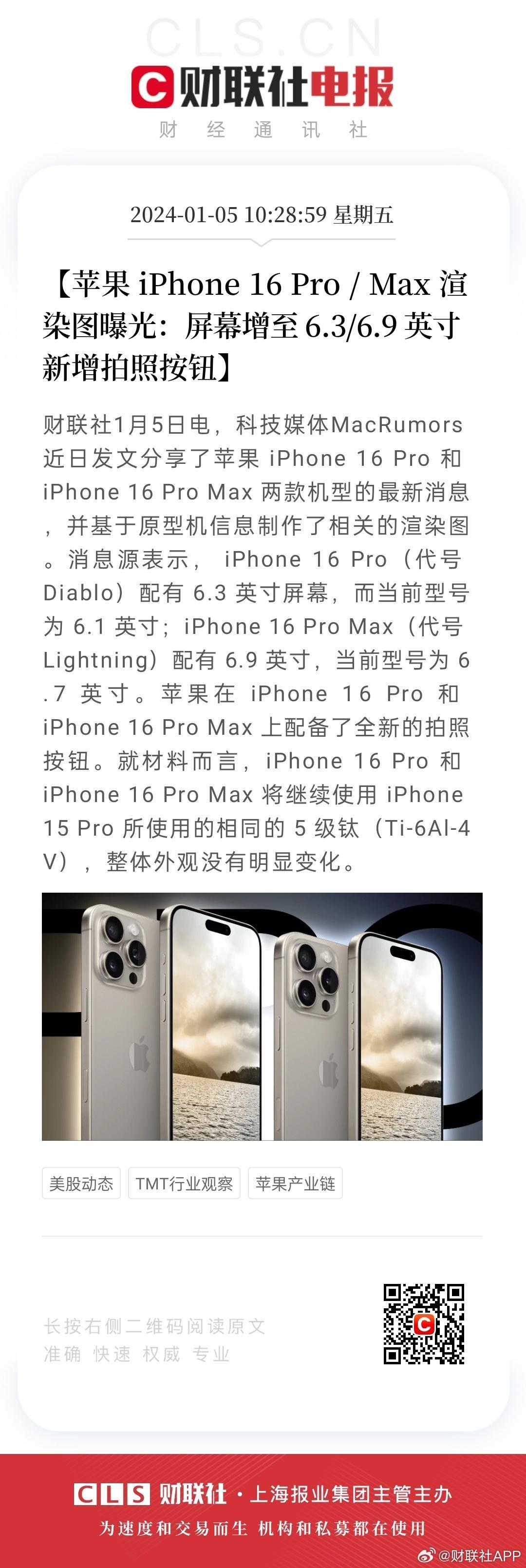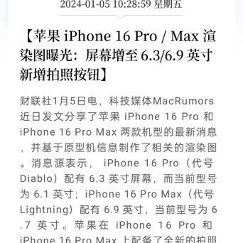 #iPhone16Pro渲染图曝光#【苹果 iPhone 16 Pro / Max 渲染图曝光:屏幕增至 6.3/6.9 英寸 新增拍照按钮】财联社1月5日电,科技媒体MacRumors 近日发文分享了苹果 iPhone 16 Pro 和 iPhone 16 Pro Max 两款机型的最新消息,并基于原型机信息制作了相关的渲染图。消息源表示, iPhone 16 Pro(代号 Diablo)配有 6.3 英寸屏幕,而当前型号为 6.1 英寸;iPhone 16 Pro Max(代号 Lightning)配有 6.9 英寸,当前型号为 6.7 英寸。苹果在 iPhone 16 Pro 和 iPhone 16 Pro Max 上配备了全新的拍照按钮。就材料而言,iPhone 16 Pro 和 iPhone 16 Pro Max 将继续使用 iPhone 15 Pro 所使用的相同的 5 级钛(Ti-6Al-4V),整体外观没有明显变化。