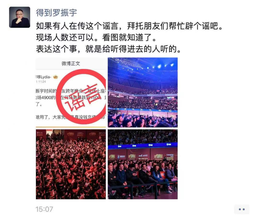 昨日有微博大V爆料称,罗振宇今年的跨年演讲现场上座率不到1/3,“大家兜里真是没钱充值信仰了”。今天下午,罗振宇在朋友圈回应称上述消息系谣传。其晒出现场人头攒动的照片,并表示“表达这个事,就是给听得进去的人听的”。