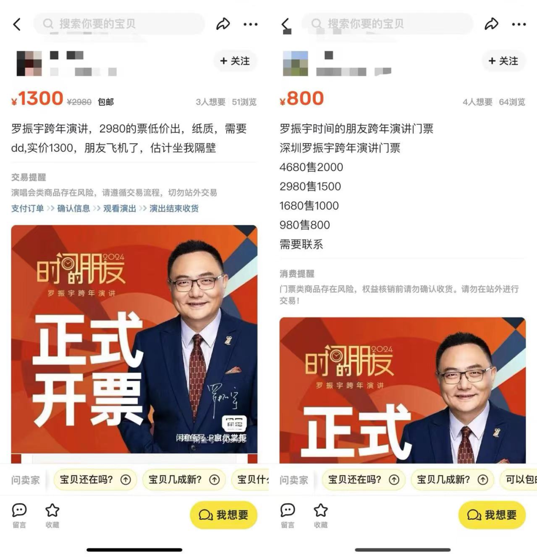 得到官方并未公布跨年演讲的票房数据,不过此前确有该场门票打折的消息传出。蓝鲸记者查询发现,二手交易平台上有不少罗振宇跨年演讲的折价门票出售,部分力度高至五折。有黄牛称,该场门票从开票起就打折售卖,“不过我囤的不多,做生意有赚有赔很正常”。