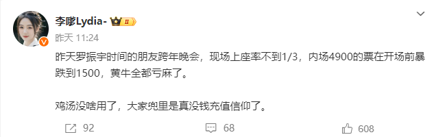 2024罗振宇跨年演讲的主会场在深圳,另外全国还设有4个分会场,其门票分为980元、1680元2980元、4680元四档,其中4680元为内场档位。昨日有微博大V爆料称:罗振宇今年的跨年演讲现场上座率不到1/3,内场4900的票在开场前暴跌到1500元。
