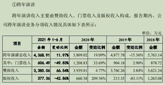 门票价格和总体收入可以部分体现罗振宇以及“时间的朋友”的IP影响力。据得到母公司思维造物招股书,2018到2021年,四期跨年演讲的门票收入分别为879万元、904万元、1209万元和606万元,累计高达3598万元。