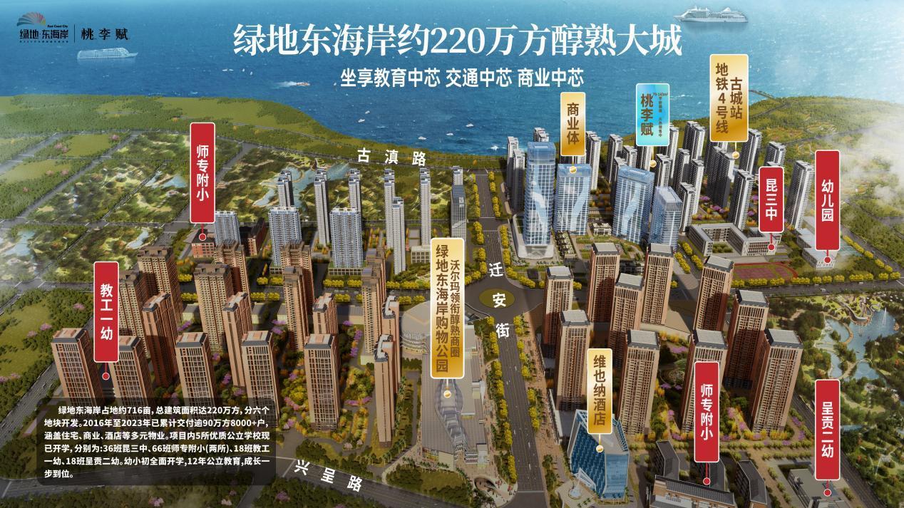 【6所学校 12年公立优教】:绿地东海岸项目配建6所学校,5所已全面开学,涵盖2所幼儿园、2所小学和1所中学,均为省一级公办性质,分别为:36班昆明市第三中学(简称“昆三中”)、66班昆明师范高等专科学校附属小学(简称“师专附小”)、18班昆明市教工第一幼儿园(简称“教工一幼”)和18班呈贡区第二幼儿园(简称“呈贡二幼”)。