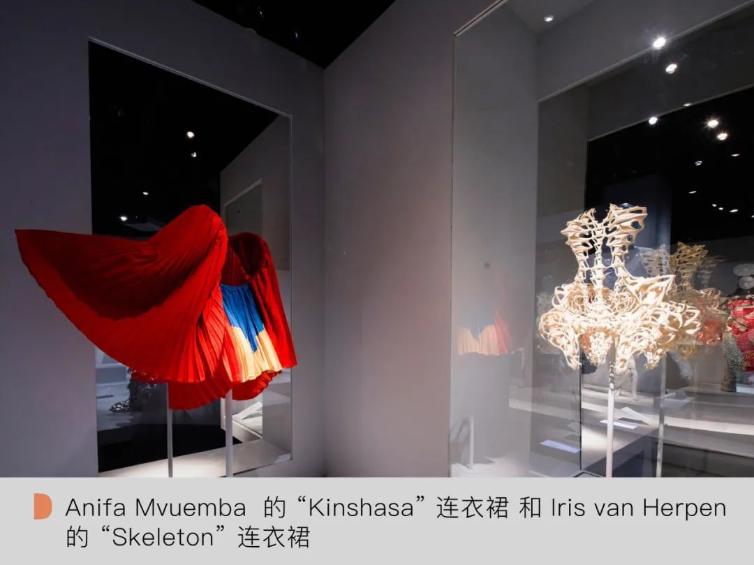 值得一提的是,当代女设计师品牌 Hanifa 创始人 Anifa Mvuemba 操刀的“Kinshasa” 连衣裙,以及设计师品牌 Iris van Herpen 通过 3D 打印制作的“Skeleton”连衣裙也吸引了不少关注的目光。