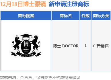 证券之星消息,根据企查查数据显示,近日博士眼镜连锁股份有限公司新提交“博士 DOCTOR”商标注册申请。商标申请详情如下: