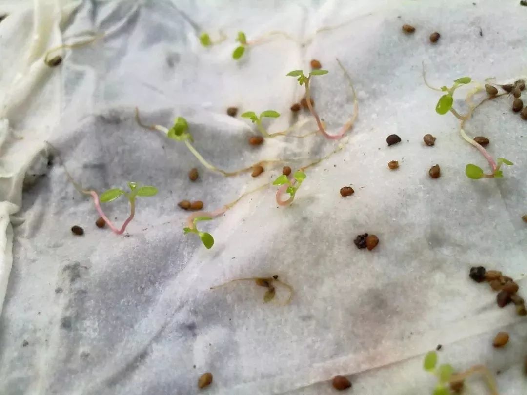 上图为草莓的种子摆放在湿润的纸巾上培育,保持纸巾湿润,温度维持在20~26度,保持一定的空气湿度,一般7天左右生根,要及时移栽到盆土里,否则小芽会在纸巾里扎根。