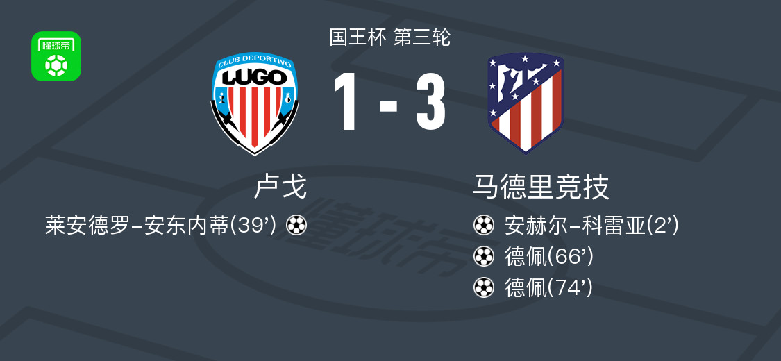 北京时间1月6日国王杯 第三轮,卢戈主场对阵马德里竞技。卢戈莱安德罗-安东内蒂破门。马德里竞技安赫尔-科雷亚破门,德佩梅开二度。最终比分1-3。