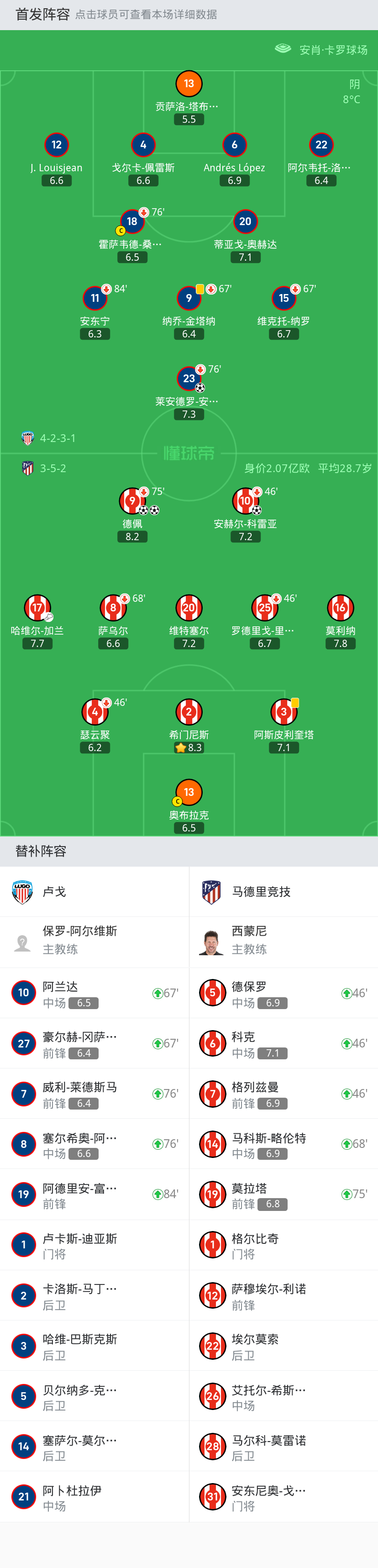 上场替补:46'7-格列兹曼, 75'19-莫拉塔, 46'6-科克, 46'5-德保罗, 68'14-马科斯-略伦特