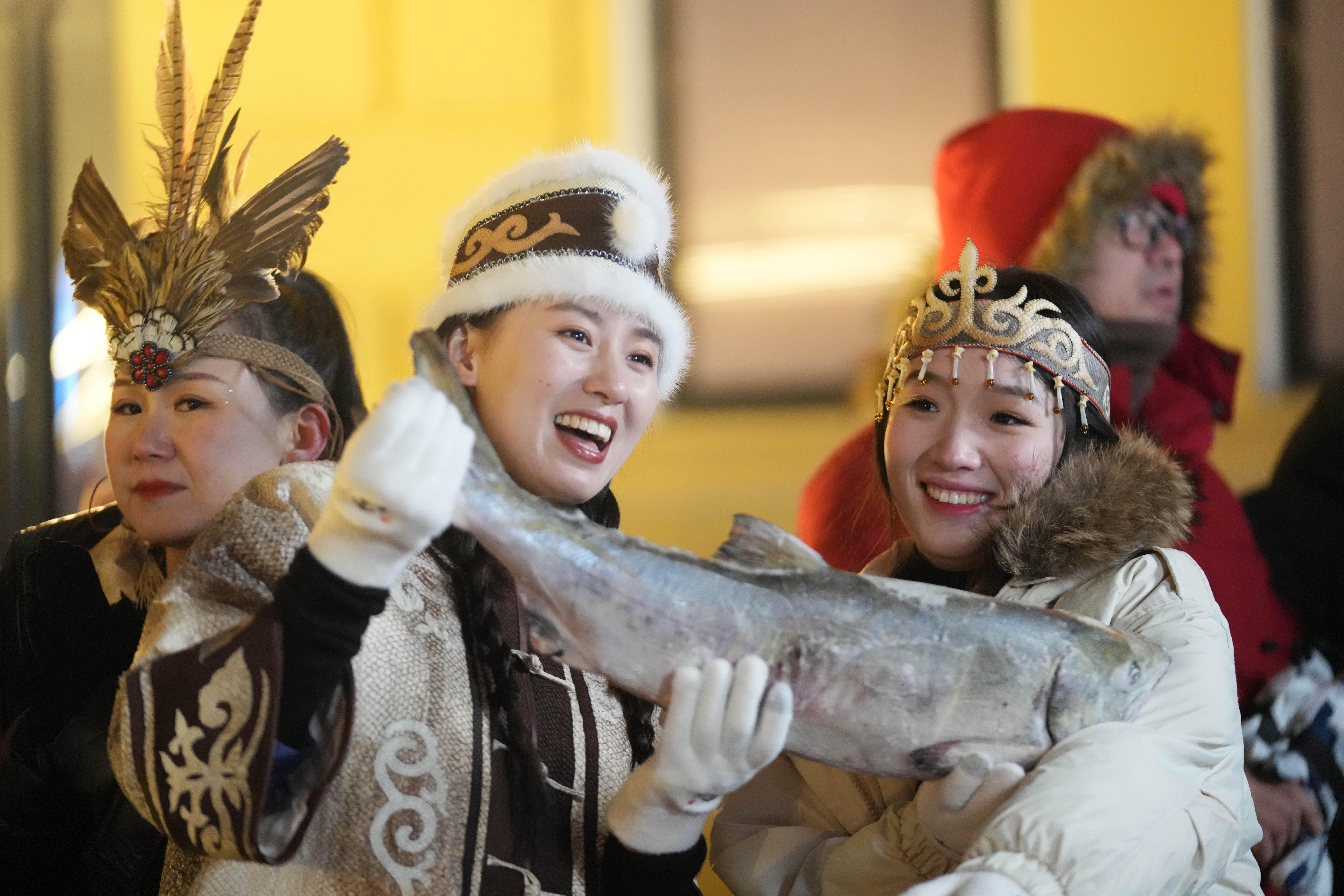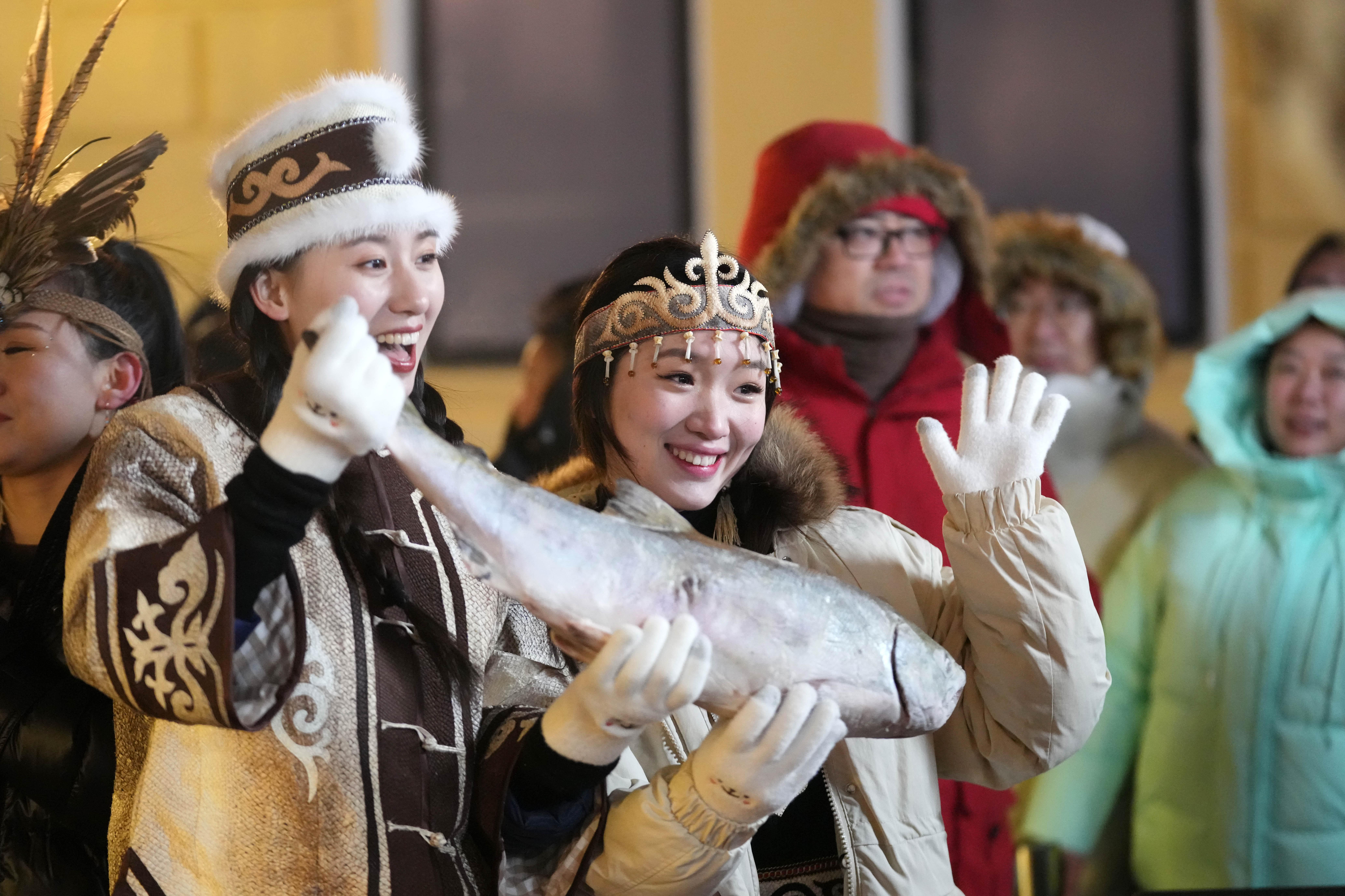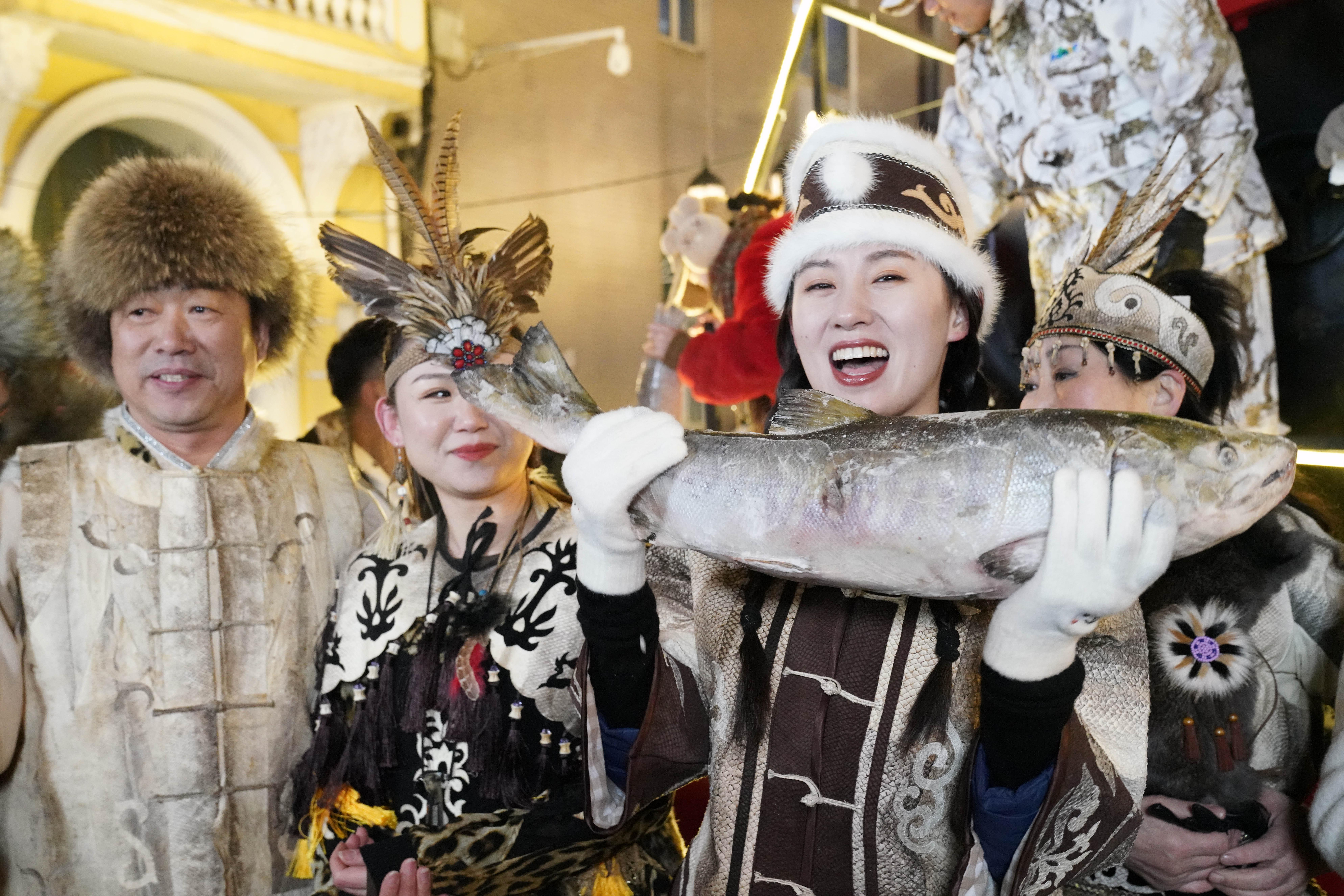 1月6日,身着赫哲族服饰的饶河县文旅推荐官在哈尔滨中央大街上推介家乡特产鱼品。 新华社记者 王建威 摄