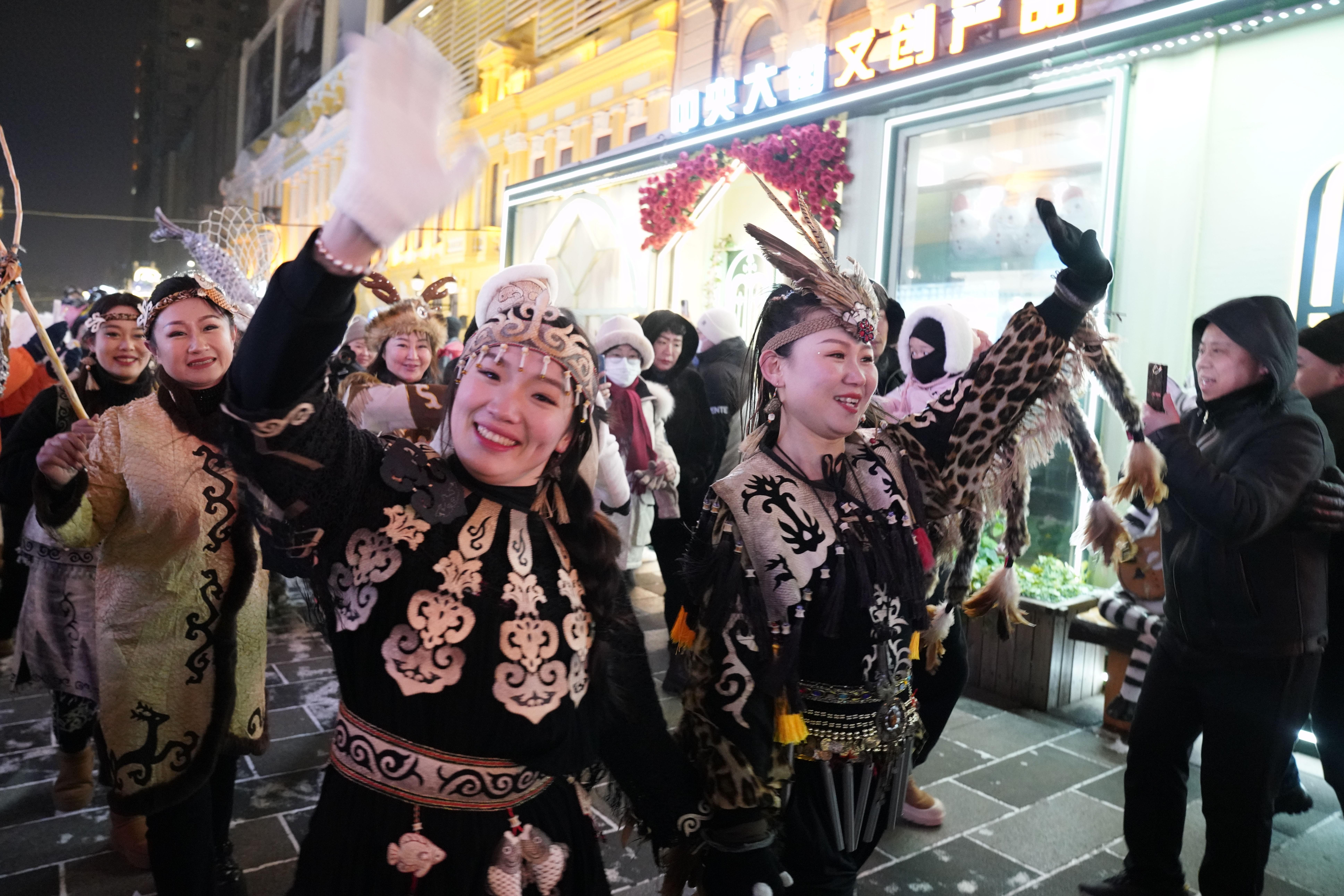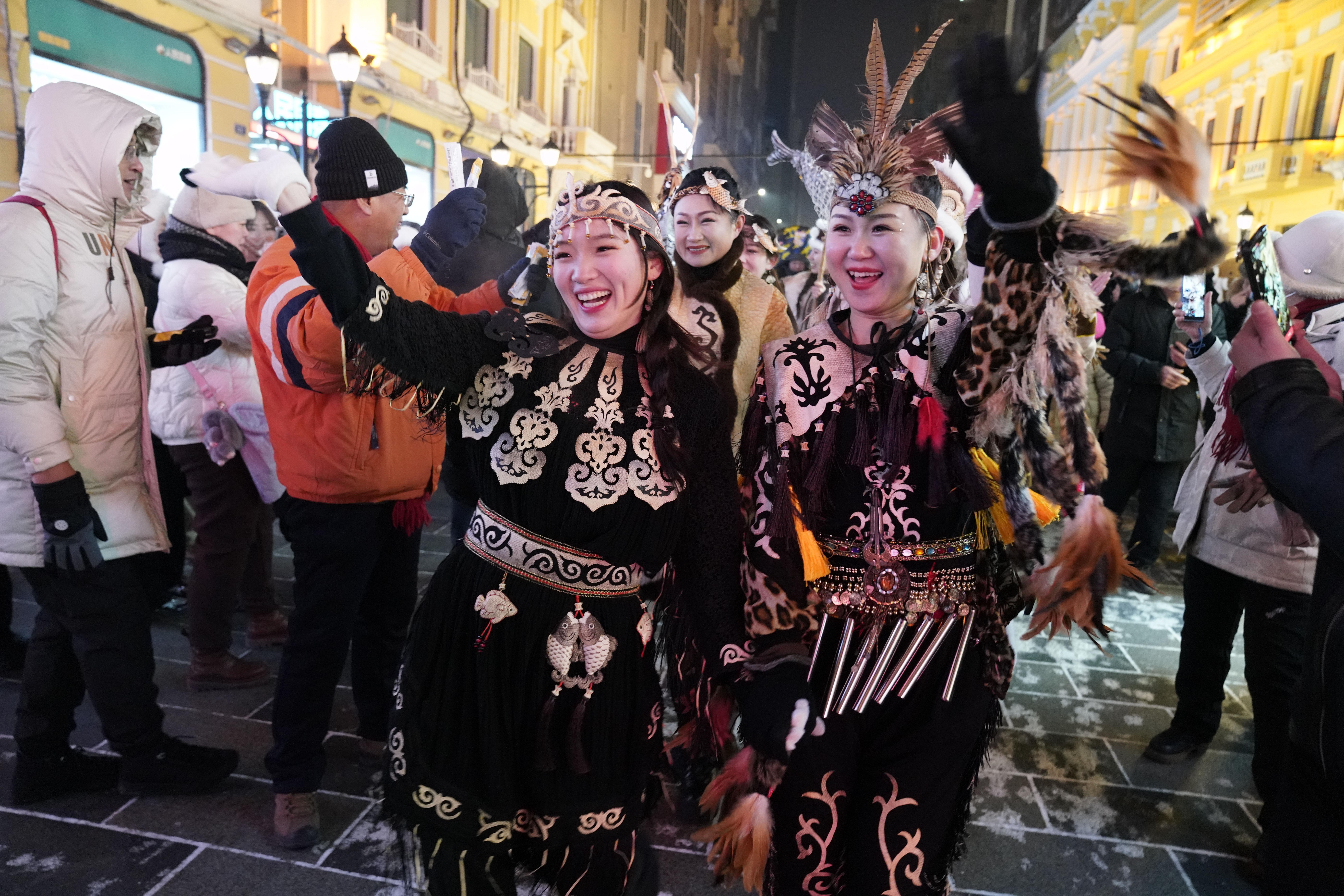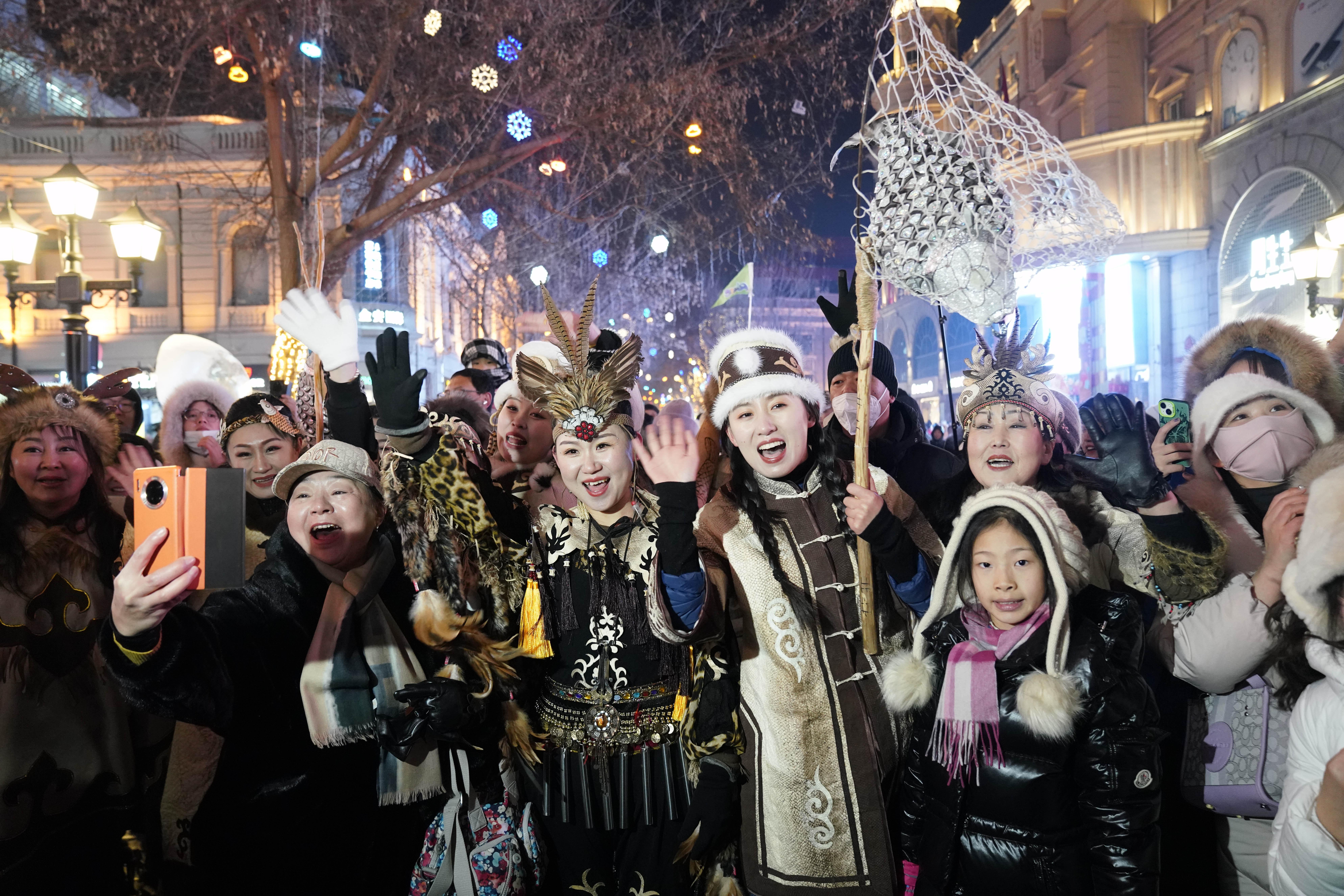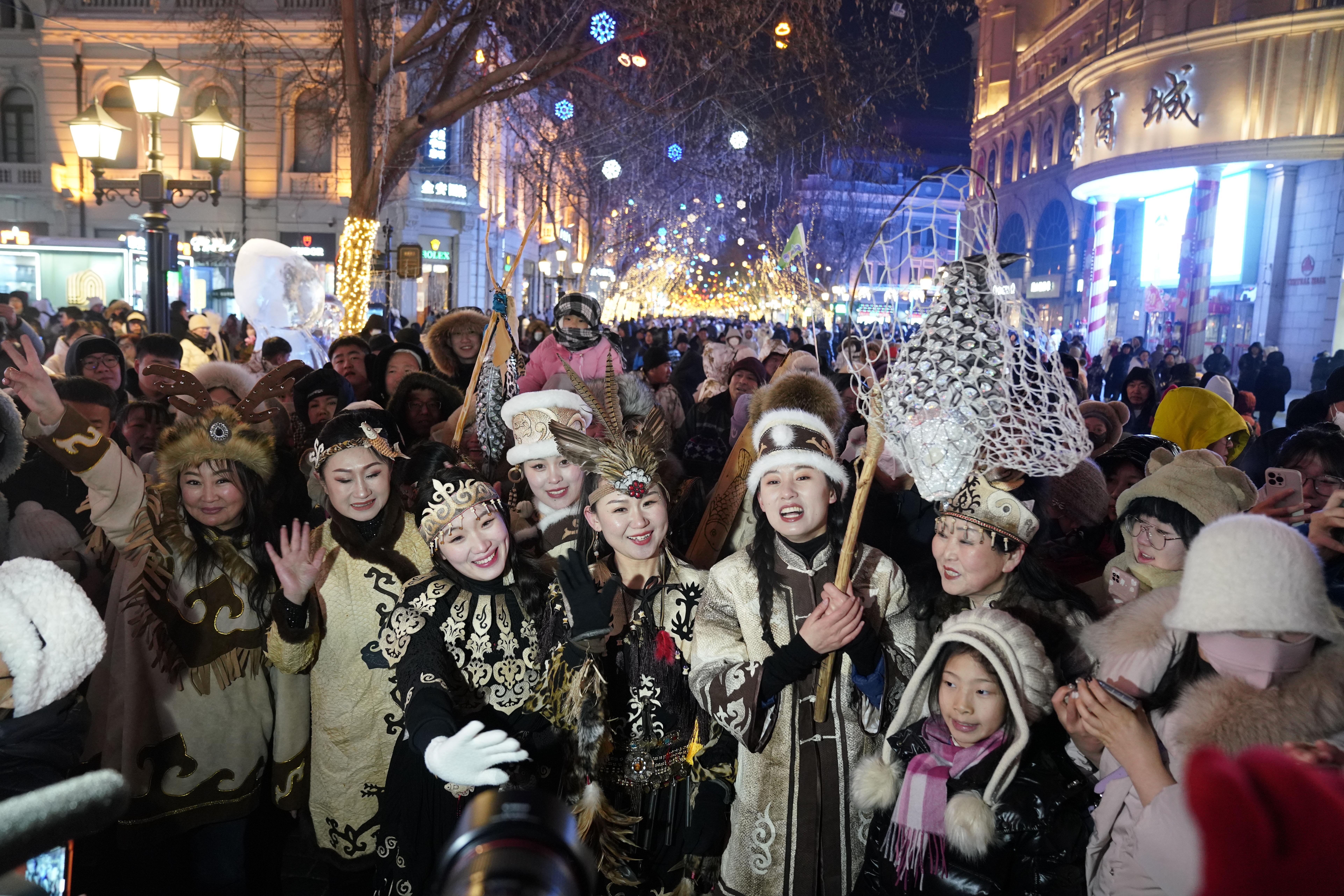1月6日,身着赫哲族服饰的赫哲族群众和饶河县文旅推荐官在哈尔滨中央大街上与游客互动。 新华社记者 王建威 摄