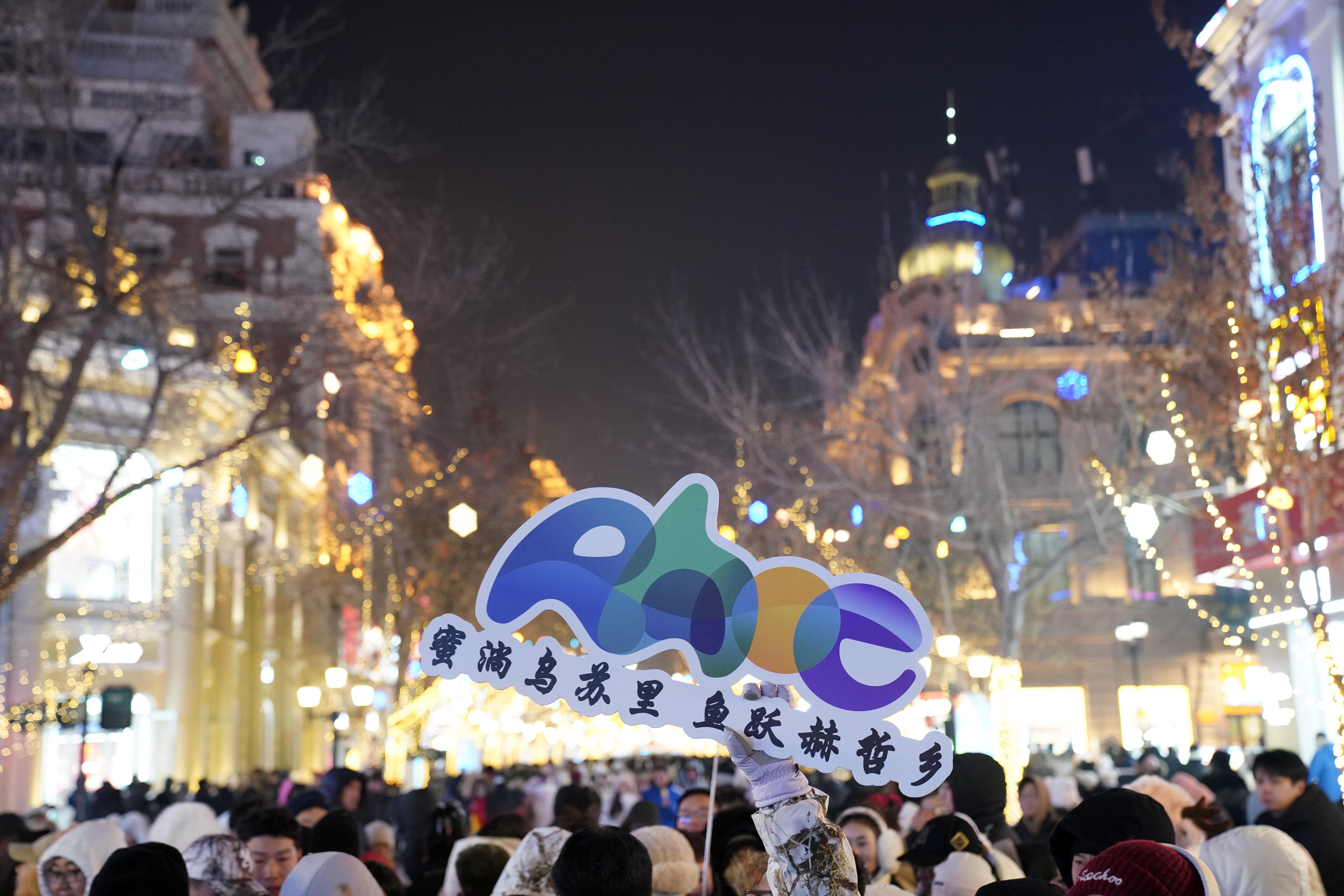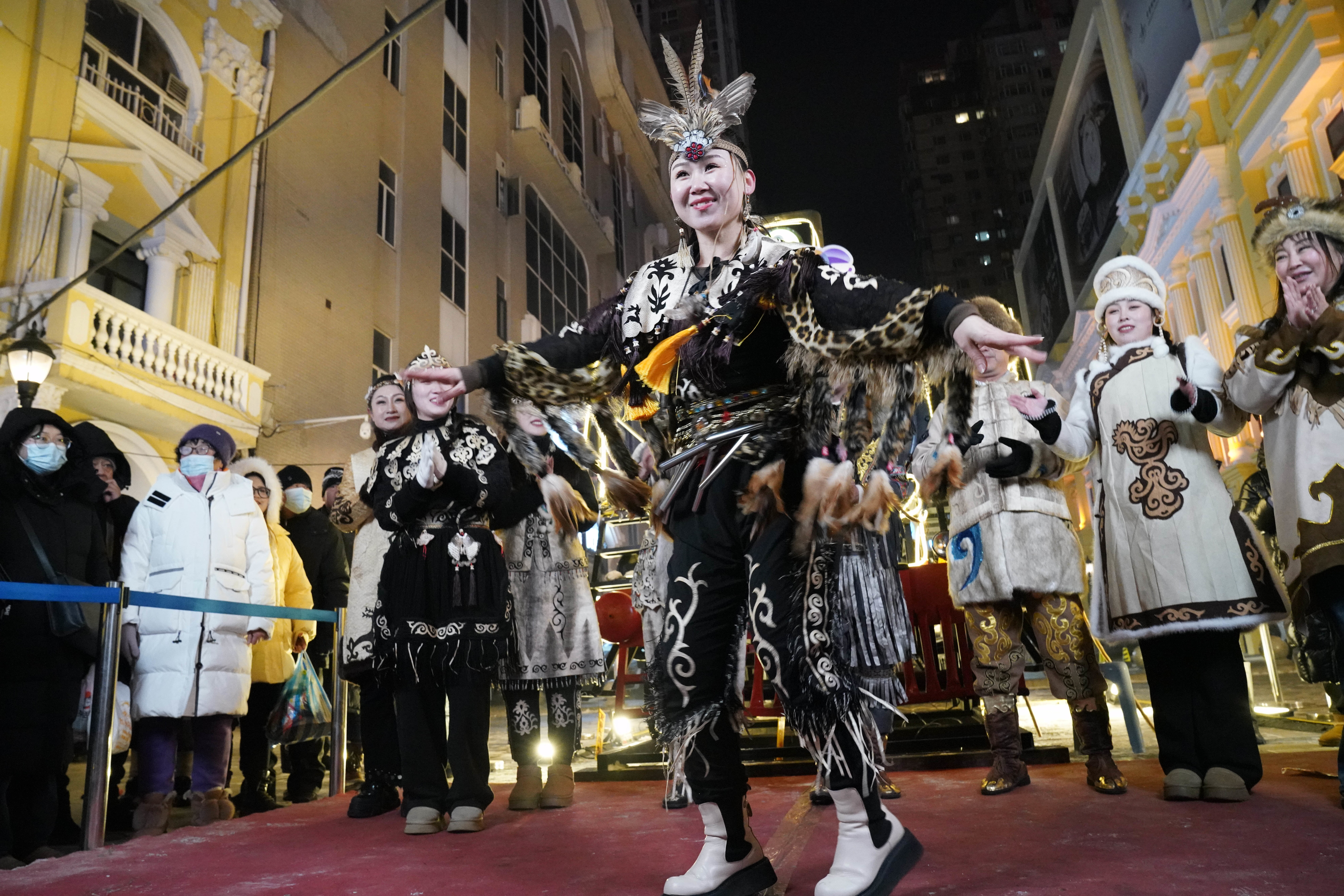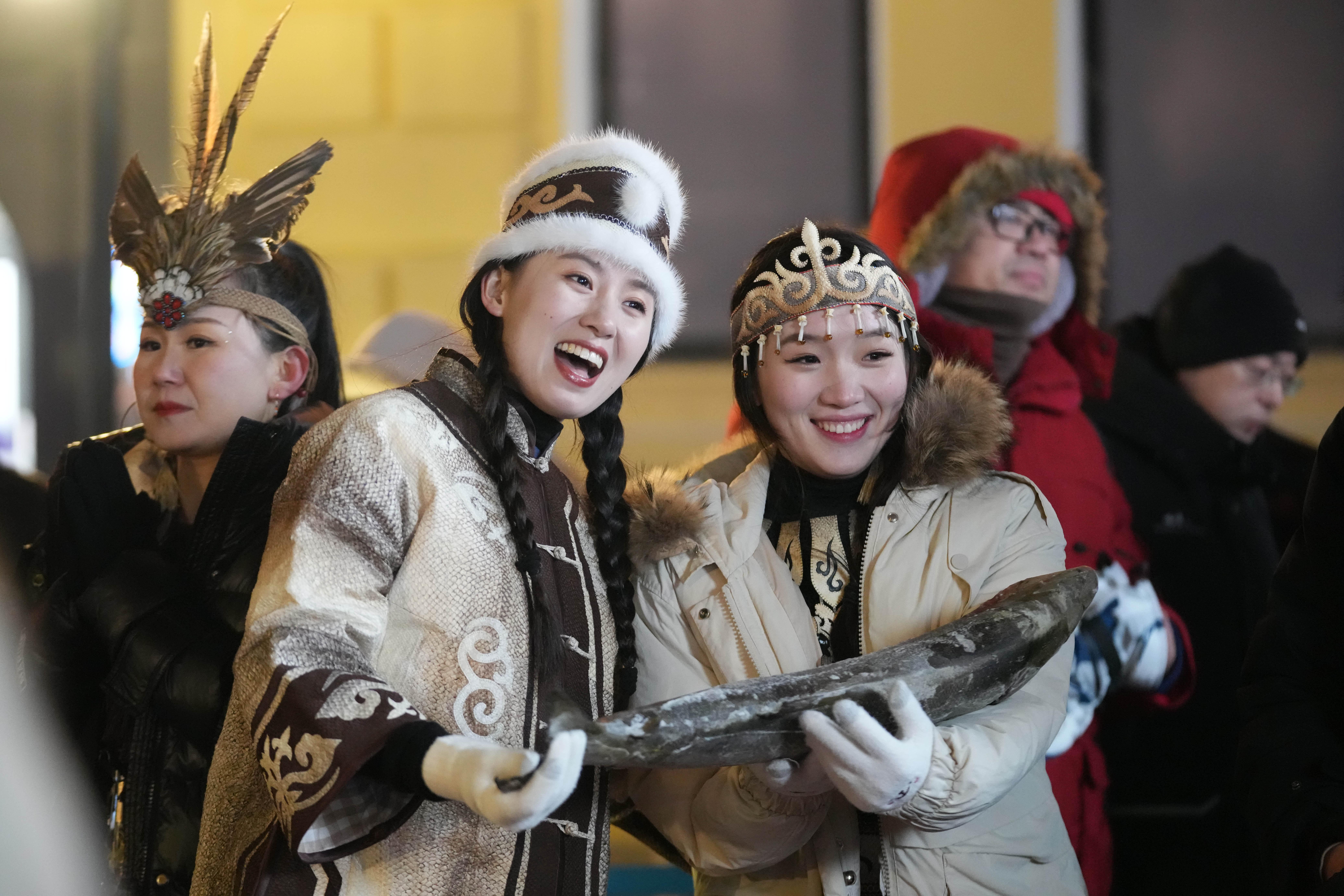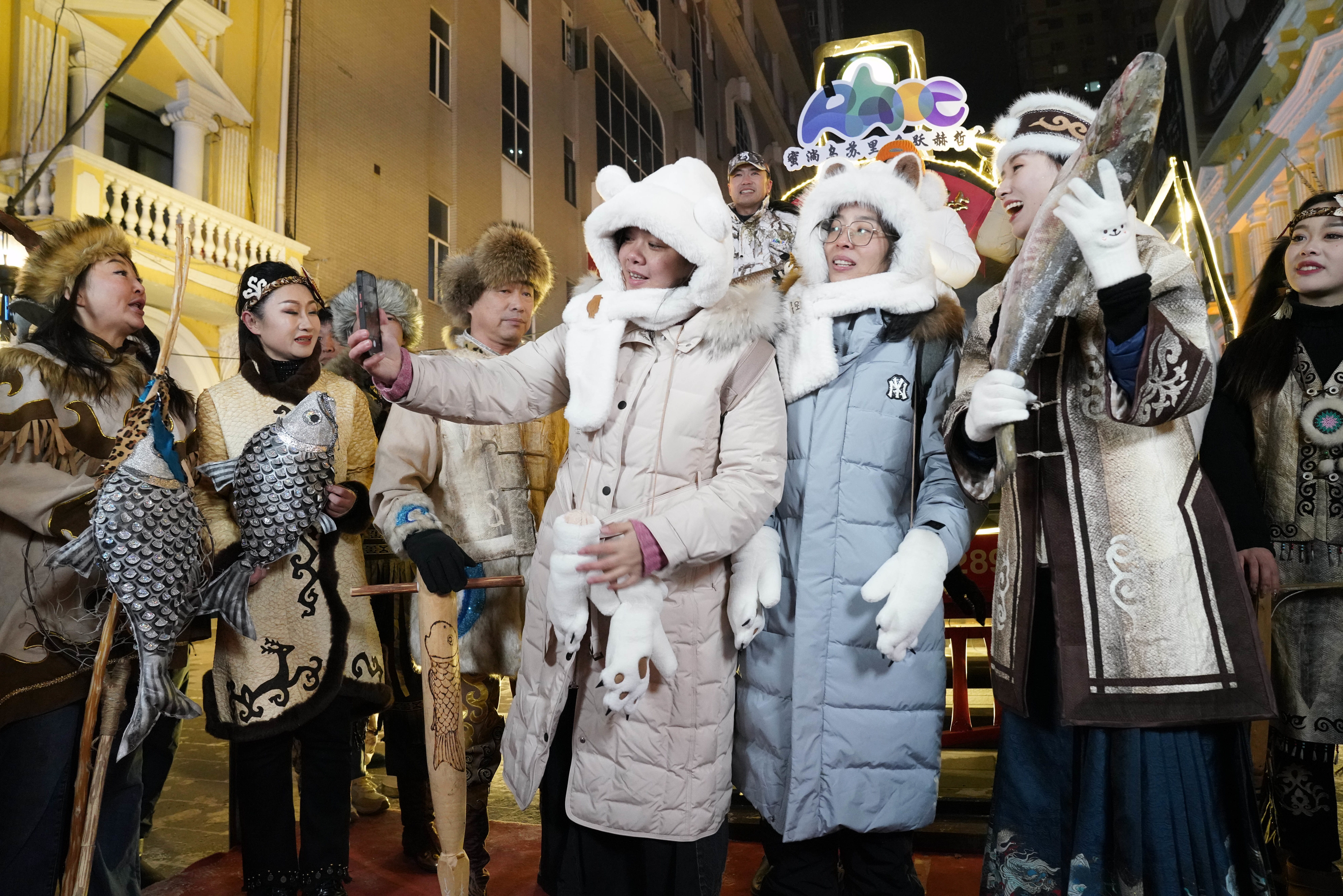 1月6日,身着赫哲族服饰的赫哲族群众和饶河县文旅推荐官在哈尔滨中央大街上与游客互动。 新华社记者 王建威 摄