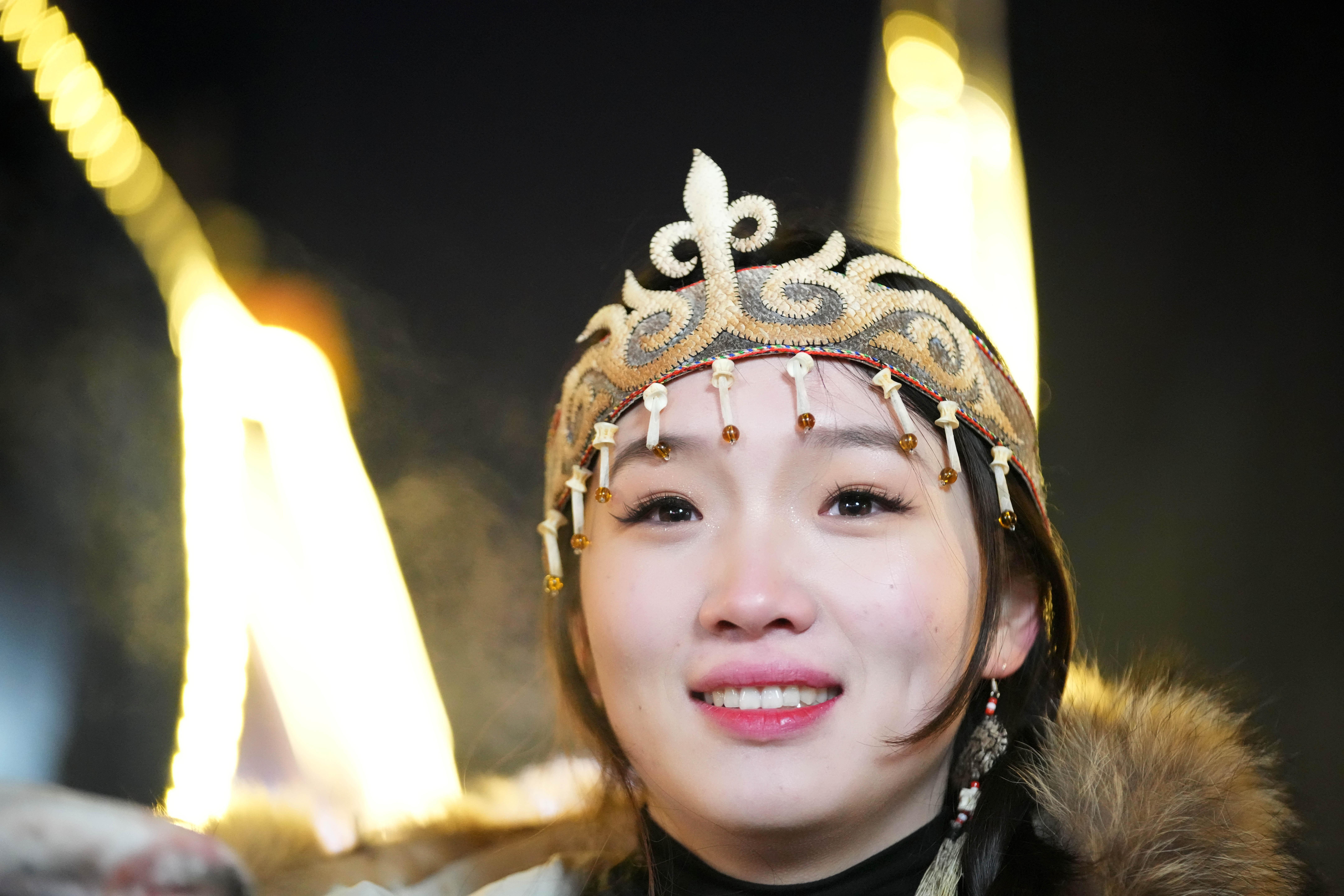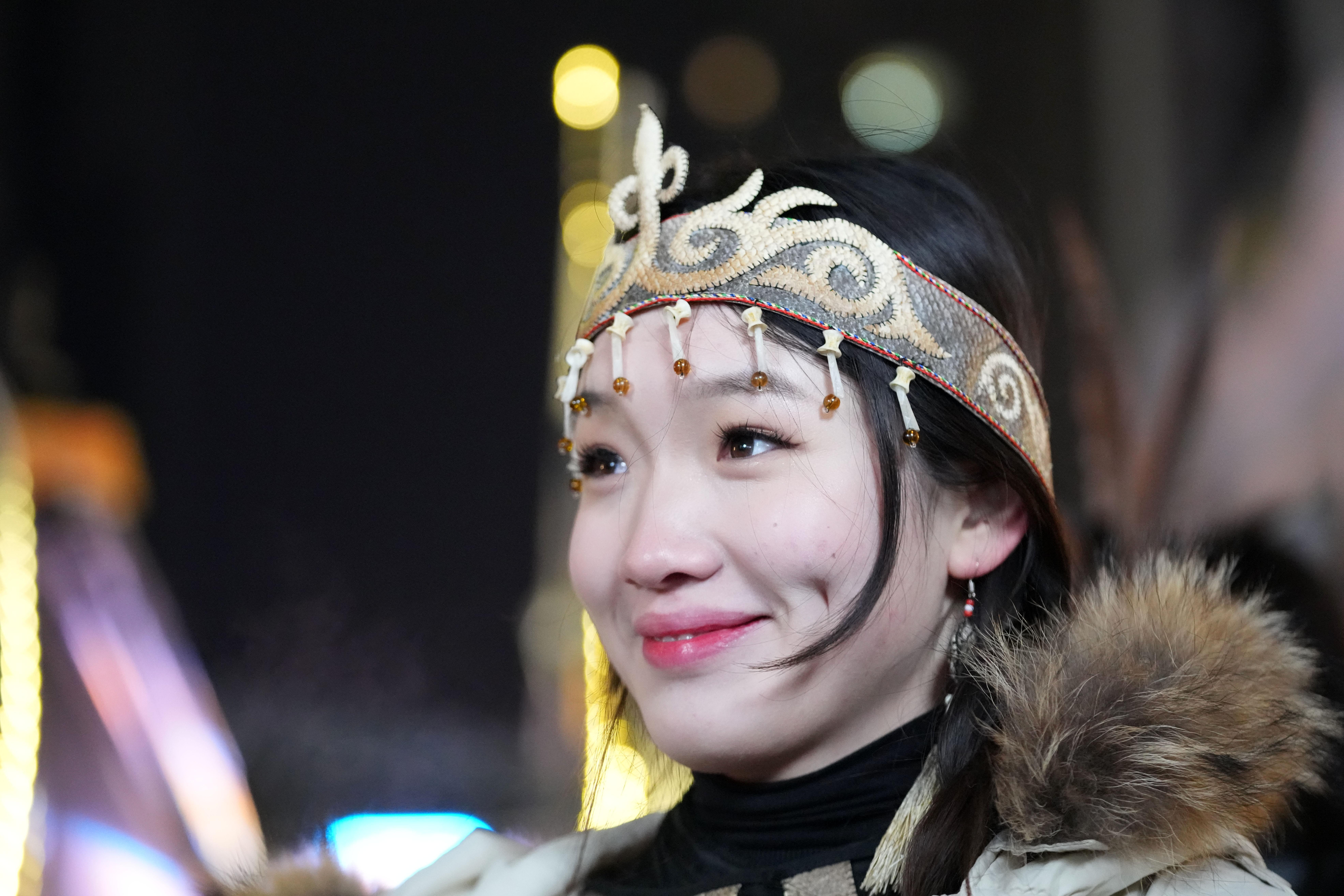 1月6日,戴着鱼皮头饰的赫哲族姑娘在哈尔滨中央大街上参与家乡推介活动。 新华社记者 王建威 摄