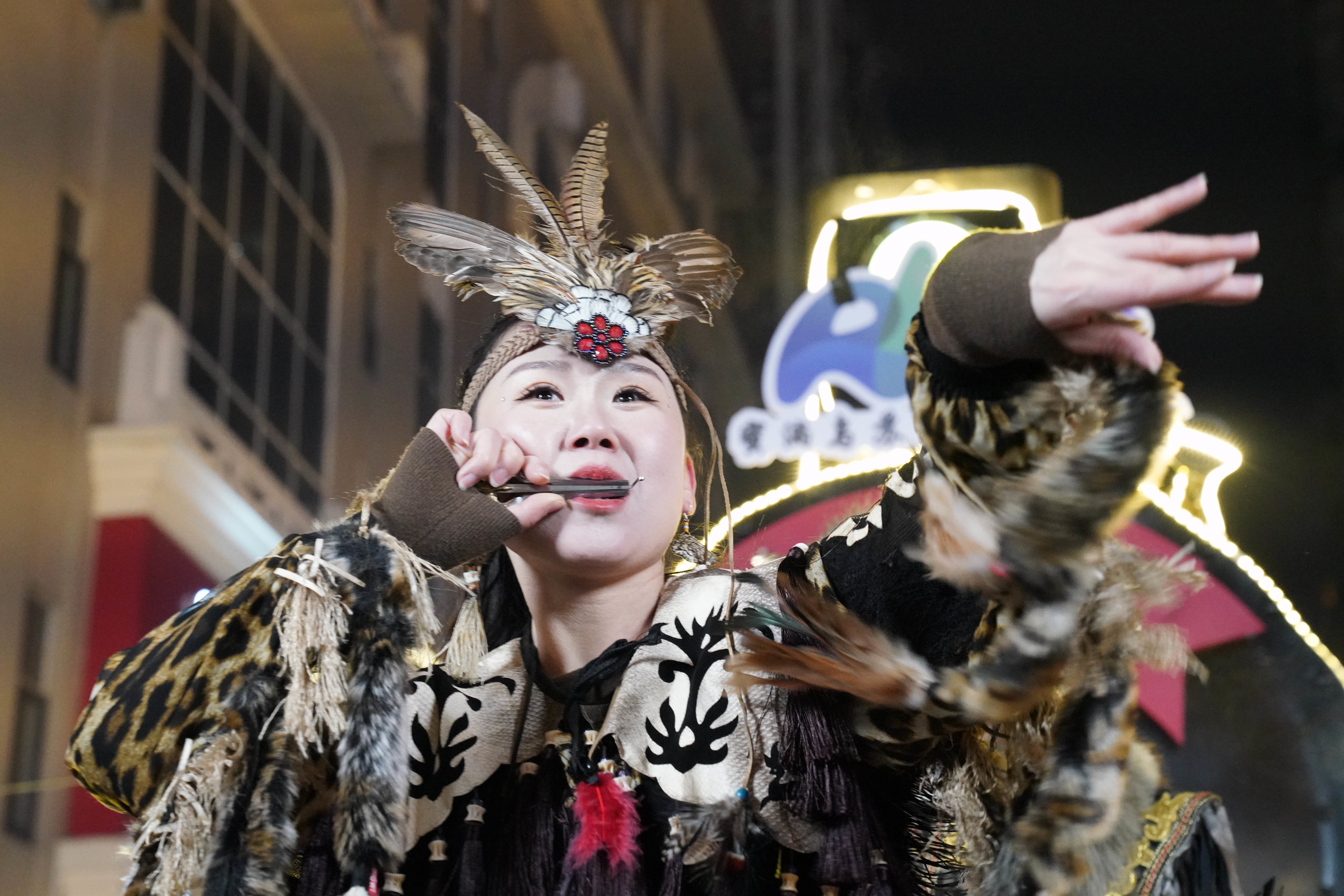 1月6日,身着赫哲族服饰的赫哲族群众在表演吹奏口弦琴。 新华社记者 王建威 摄
