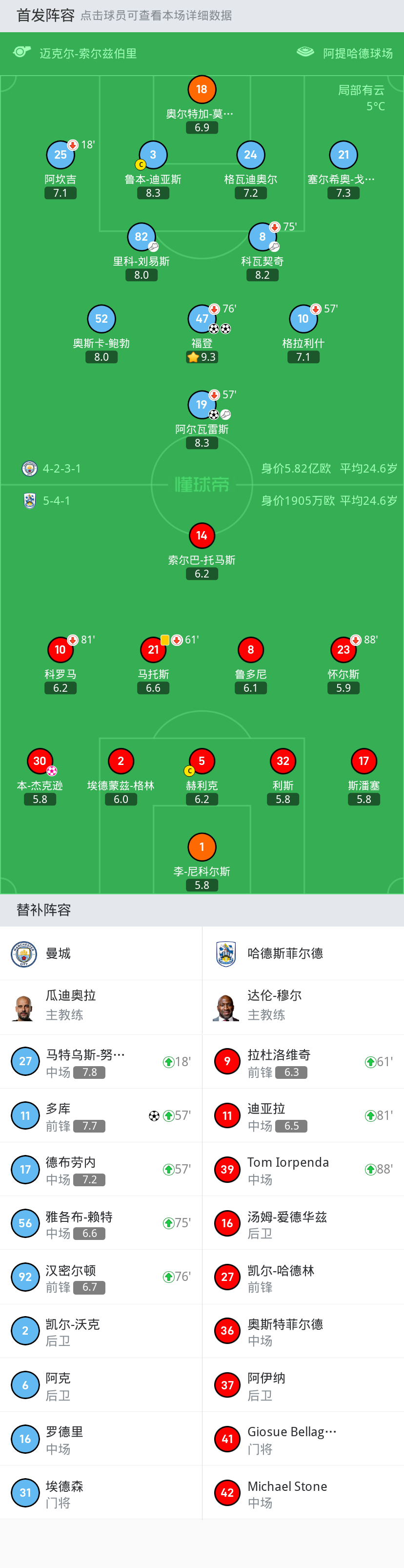 替换下场:75'8-科瓦契奇, 57'10-格拉利什, 18'25-阿坎吉, 76'47-福登, 57'19-阿尔瓦雷斯