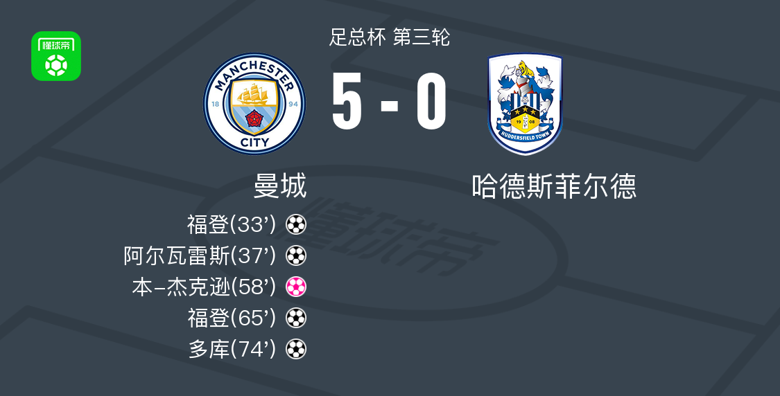 北京时间1月7日足总杯 第三轮,曼城主场对阵哈德斯菲尔德。曼城福登梅开二度,阿尔瓦雷斯破门,多库破门。哈德斯菲尔德本-杰克逊自摆乌龙。最终比分5-0。