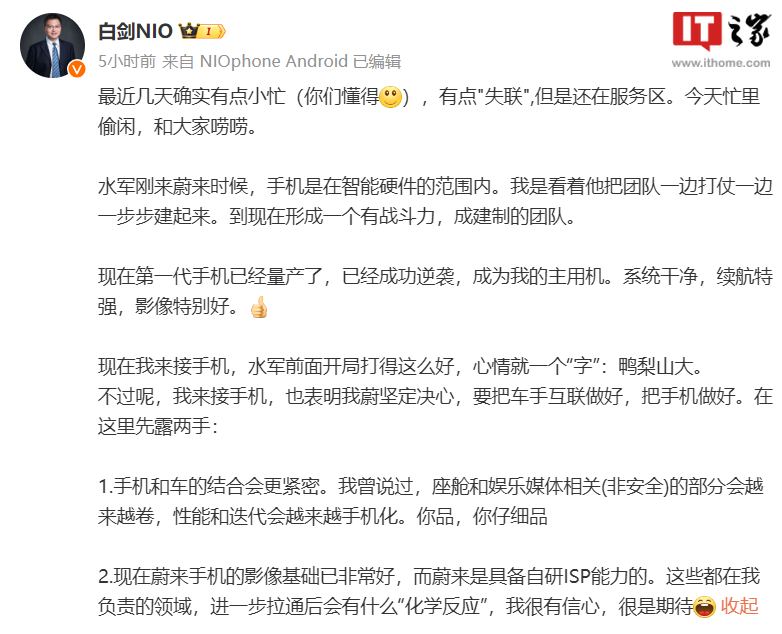 针对“蔚来手机负责人尹水军将离职,硬件负责人白剑兼管”的传闻,白剑本人在微博进行了确认。